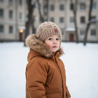 A small boy stands outside in a wintry setting, his body slightly turned to the side, looking into the camera, his arms at his sides. The frame encom…
