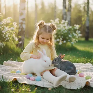 Не меняй черты лица Кинематографический портрет среднего формата, запечатлевший нежный пасхальный момент в мягком золотистом свете. Маленькая девочка…