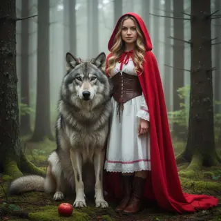 A young girl embodies the image of Little Red Riding Hood, standing next to a large, majestic gray wolf. The girl looks directly at the viewer with a…