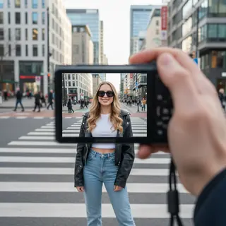 ultra-detailed lifestyle street photograph captured in the middle of a city crosswalk, showing a creative perspective where a woman is photographed t…