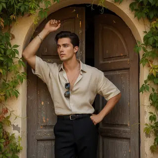ultra-detailed lifestyle fashion portrait of a young man standing in the doorway of an old Mediterranean-style house surrounded by hanging green vine…