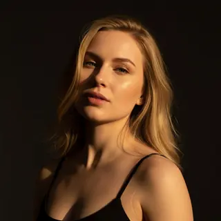 ultra-detailed cinematic beauty portrait of a woman with dramatic natural sunlight cutting across her face against a dark background. Camera angle: t…