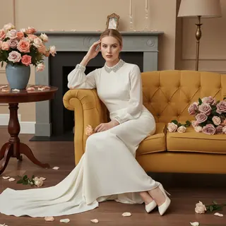 A woman sits reclining on a soft sofa in a classic interior space, her body slightly angled diagonally toward the camera. She leans back against the…