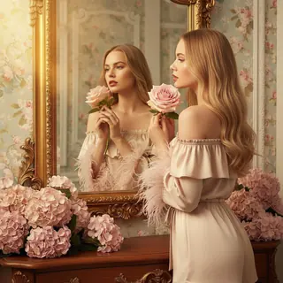 A woman stands in front of an ornate vintage mirror in an elegant floral setting. She gently holds a large pink rose to her face, gazing at her refle…