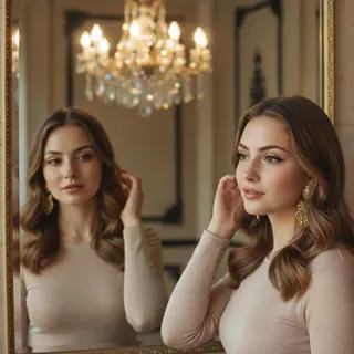 Ультрареалистичный портрет женщины с точным сохранением внешности с референсного фото — 100% сходство. Она стоит в элегантном интерьере с полированны…