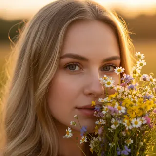 A woman holds a branch of flowers in her hand, bringing it to her face. Her head is slightly tilted toward the flowers, looking at the camera. Her bo…