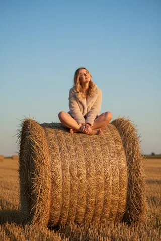 Молодая девушка в белом лёгком платье сидит босиком на крупном круглом рулоне сена в поле, сидит по-турецки (скрестив ноги), слегка откинула голову н…