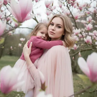 A woman holds a child in her arms, her body turned three-quarters, creating a sense of movement and a vibrant moment. The child hugs her shoulders. T…