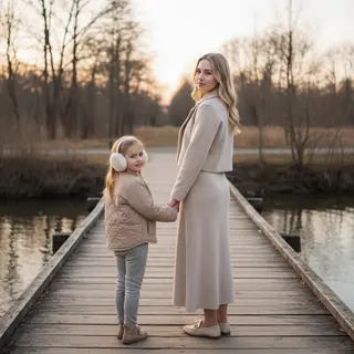 A woman and a little girl stand on a wooden bridge by the water, their backs to the camera, looking over their shoulders, holding hands, and looking…