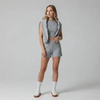 The woman stands in a studio against a neutral background, her body turned frontally with a slight tilt at the hip. One arm hangs at her side, the ot…