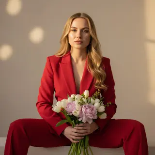 Не меняя внешность, сходство 100%. Создай крупный портрет, эстетичный снимок в стиле высокой моды (Vogue). В центре композиции — девушка, сидящая на…