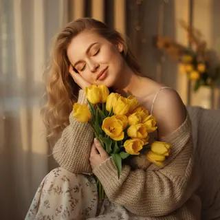 A young girl stands in an interior, holding a dense bouquet of yellow tulips with long green stems and closed buds. Her body is turned three-quarters…