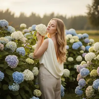 Молодая женщина с длинными волнистыми волосами стоит в цветущем саду среди пышных кустов голубых и молочно-белых гортензий. Кремовый топ с открытой с…