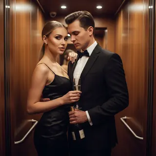 A man and a woman are in a narrow, wood-paneled elevator. The man is turned toward the woman, leaning toward her face. One arm holds a bottle of spar…