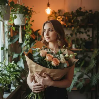 Гиперреалистичная фотография молодой женщины в интимной обстановке, она находится в комнате с обилием зелени. Она держит большой букет свежих цветов…