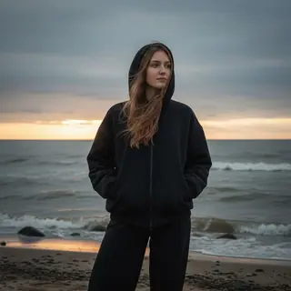 A photo of a woman on the seashore. She is facing the camera, her body slightly relaxed, her hands tucked into her jacket pockets, her head slightly…