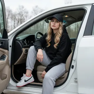 A woman is sitting sideways in the driver's seat of a car with the door open. Her body is slightly turned toward the camera. One leg is bent and rest…