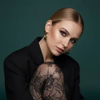 A woman stands in a studio against a plain background, her body turned three-quarters, her head turned toward the lens and slightly tilted back. Her…