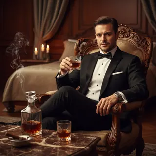 A man sits in a massive chair with carved wooden armrests, his body slightly reclined, one leg crossed over the other. He holds a glass tumbler fille…