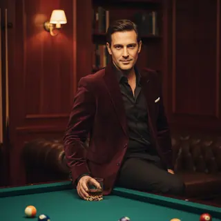 A man sits leaning against the edge of a pool table, looking directly at the camera, his pose frozen in place. The shot is medium-length, from mid-th…
